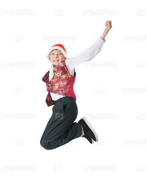 Радостный мальчик в шапке Санта-Клауса на белом фоне