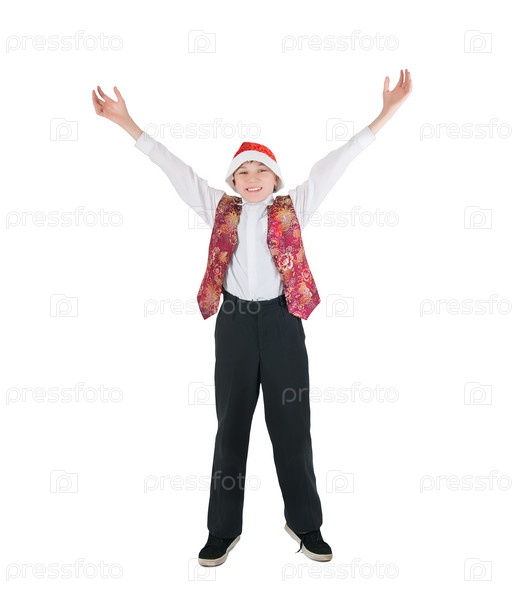 Счастливый мальчик в шапке Санта-Клауса на белом фоне