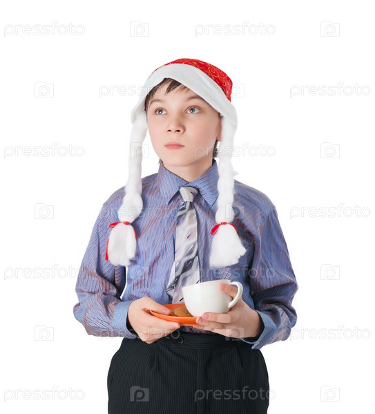 Задумчивый мальчик в рождественской шапке на белом фоне