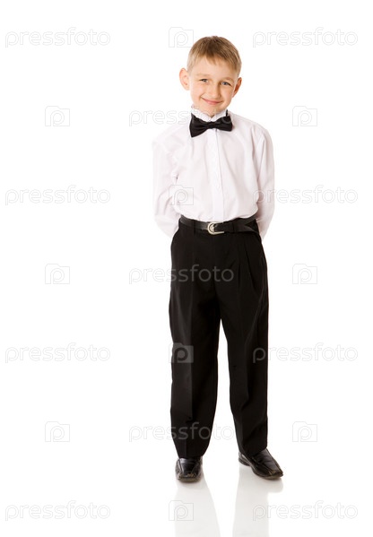 Портрет улыбающегося мальчика в официальном костюме на белом фоне