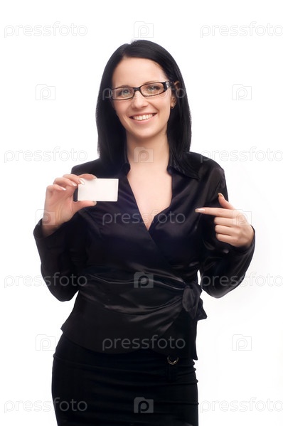 Деловая женщина с визитной карточкой на белом изолированном фоне