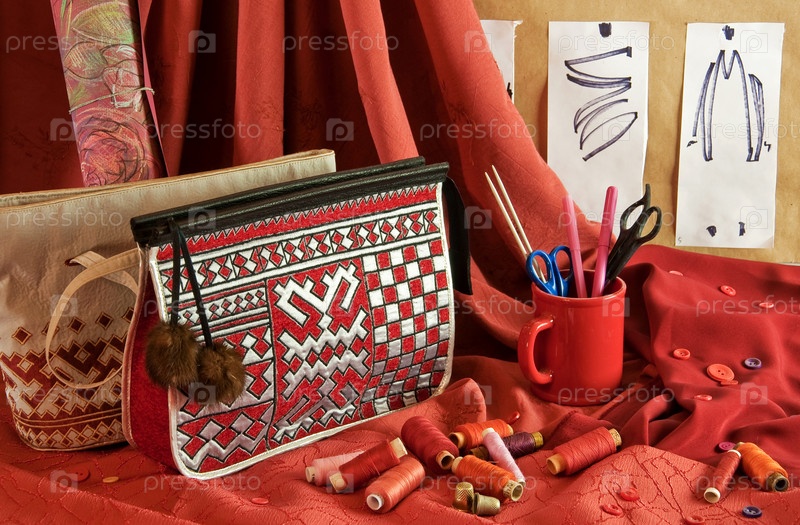 Модные эскизы, сумочки, красная ткань, кнопки и нить