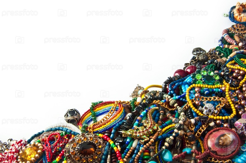 Куча многоцветных ярких украшений, изолированная на белом фоне