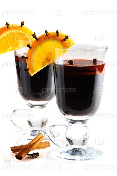 Глинтвейн в бокалах, апельсин, корица и гвоздика