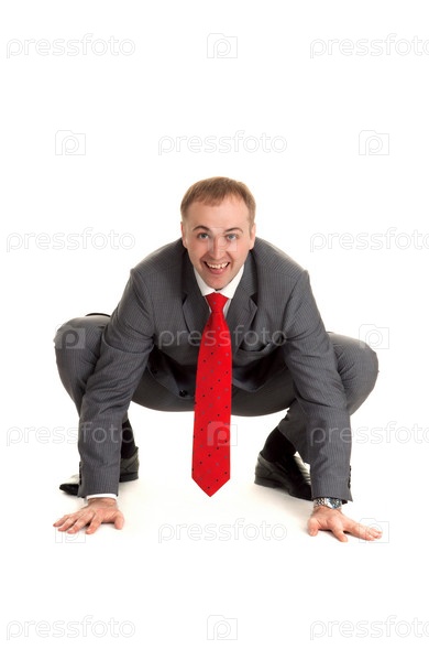 Человек в сером костюме и красном галстуке сидит в позе лягушки
