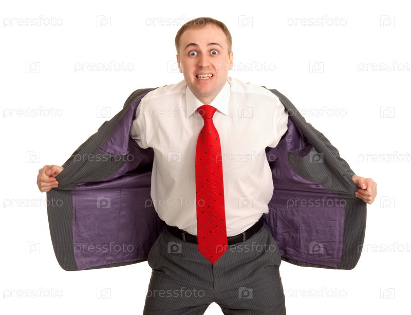 Человек в белой рубашке и красном галстуке снимает пиджак