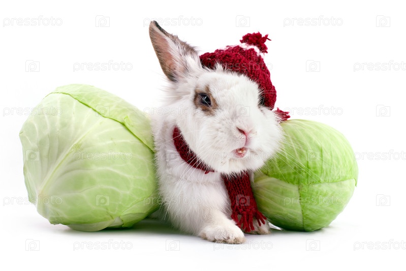 Кролик, одетый в шапку и шарф, и капуста. Белый фон