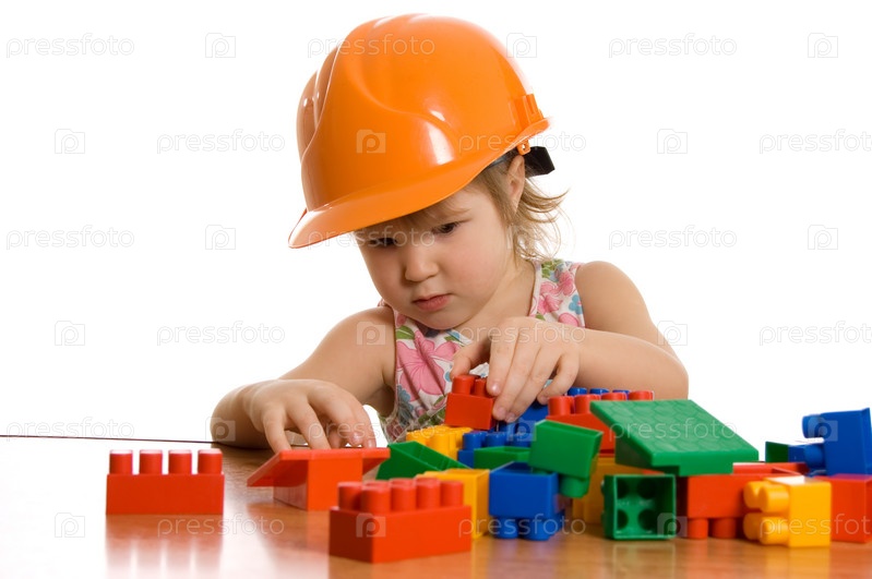 Портрет маленькой девочки в строительной каске, собирающей конструктор на белом фоне