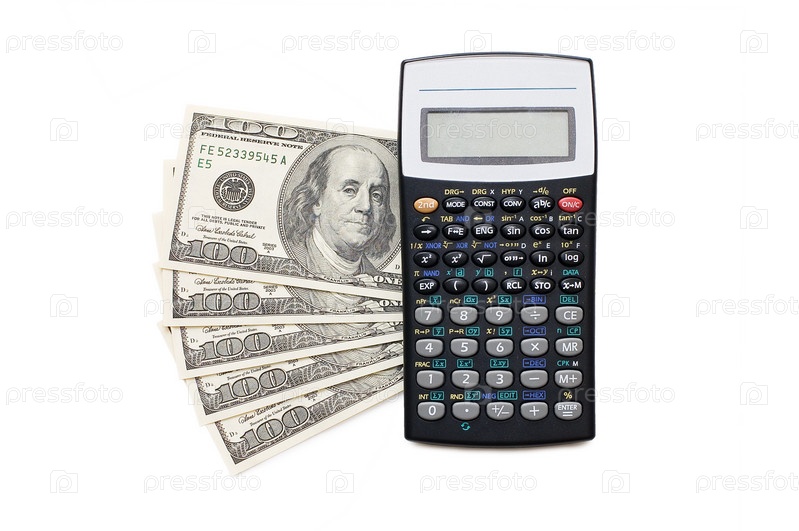 Калькулятор и американские доллары на белом фоне