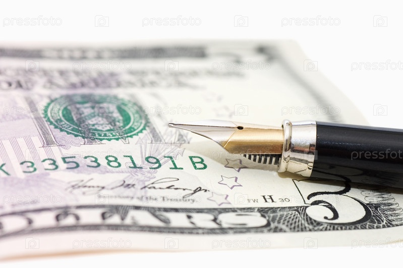 Банкнота достоинством в пять американских долларов и перьевая ручка на белом фоне