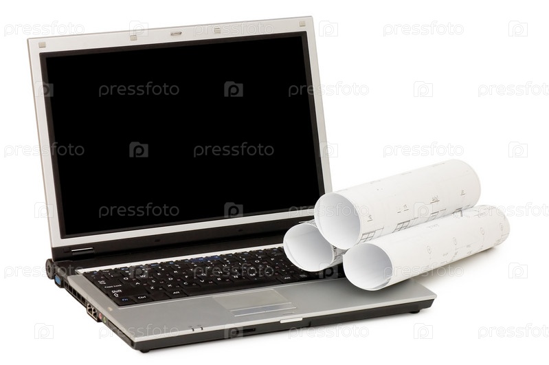 Три чертежа и ноутбук, изолированные на белом фоне