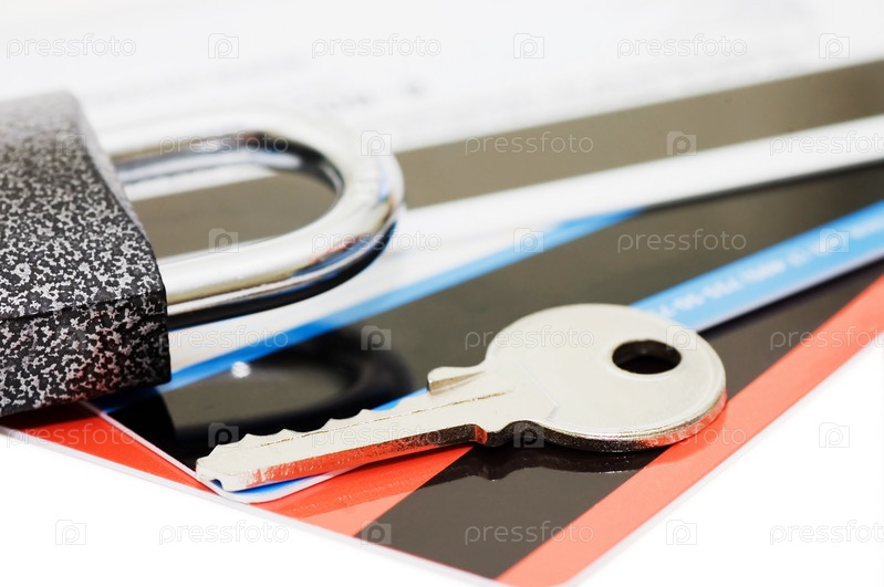 Замок с ключом, лежащие на кредитных картах на белом фоне