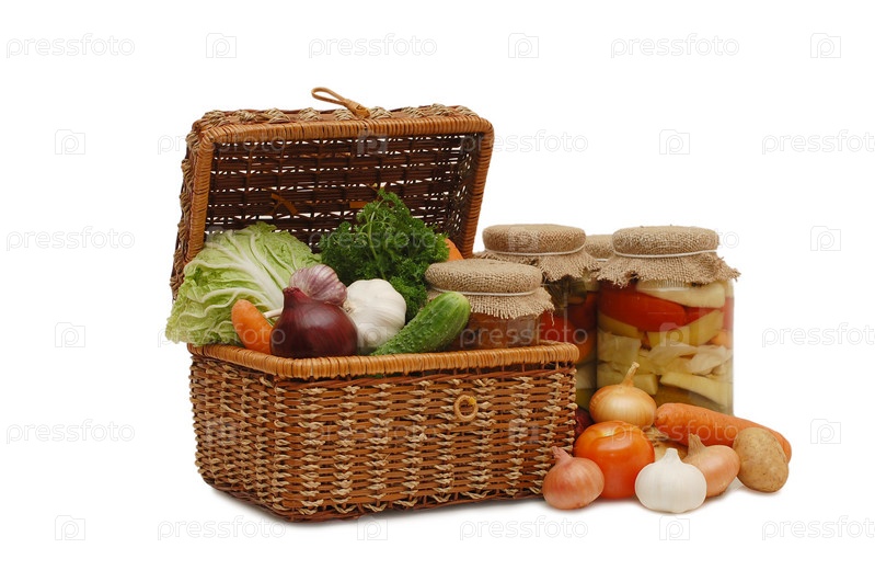Свежие и консервированные овощи в плетеном сундучке на белом фоне