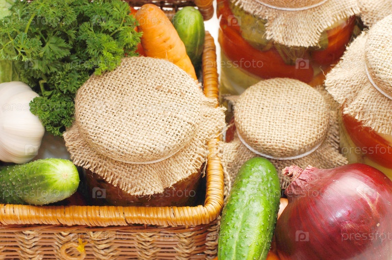 Свежие и консервированные овощи в плетеном сундучке на белом фоне
