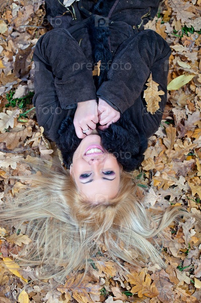 Улыбающаяся девушка лежит на опавших листьях