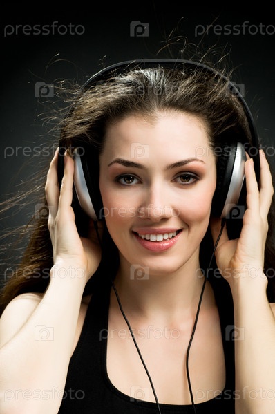 Девушка в наушниках на черном фоне