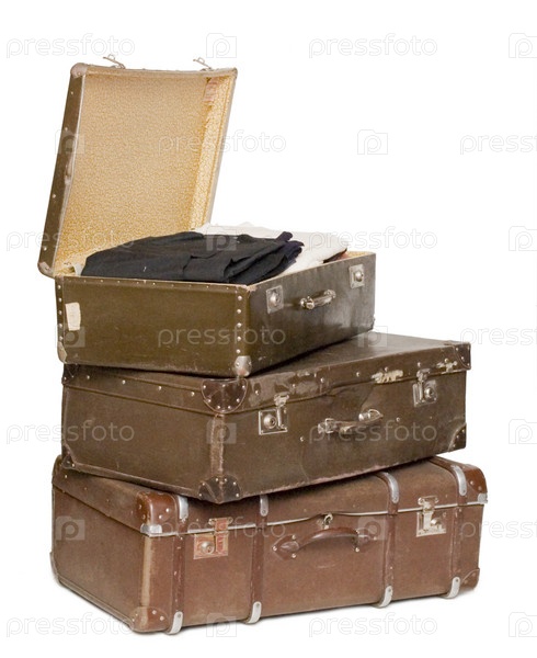 Груда старых антикварных чемоданов, изолированных на белом фоне