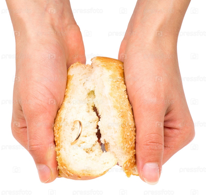 Руки разламывают булочку с обручальным кольцом внутри, на белом фоне