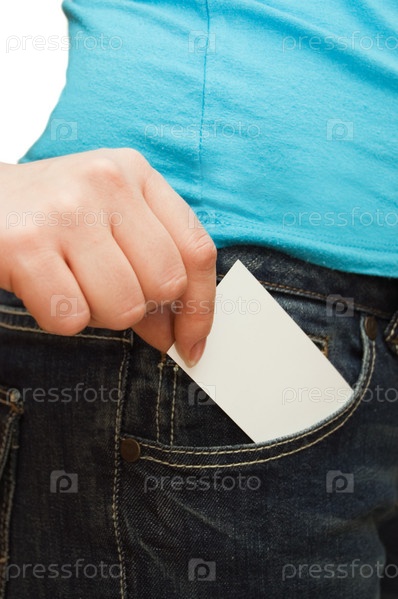 Девушка достает визитку из кармана джинсов