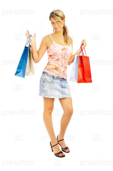 Портрет молодой красивой девушки с подарочными пакетами в руках