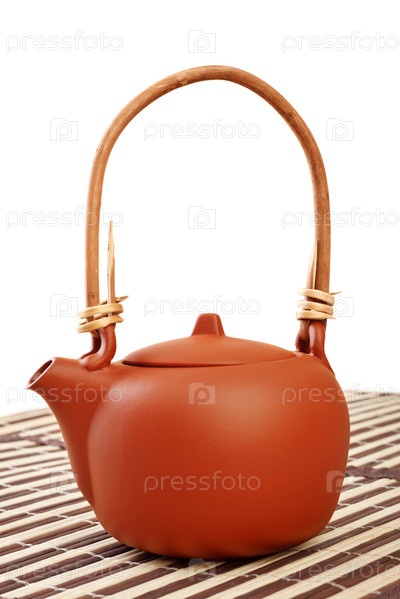 Глиняный чайник на бамбуковой салфетке изолирован на белом