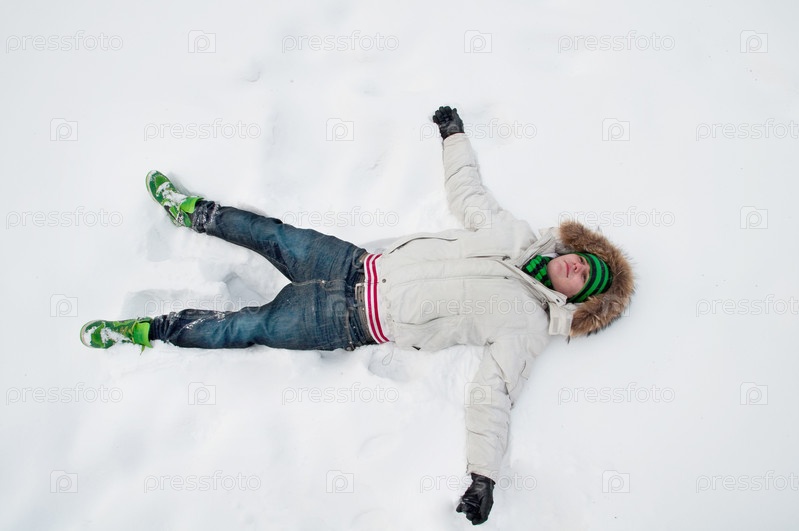 Молодой человек лежит на снегу в зимнем парке
