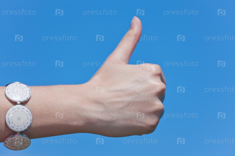 Жест большим пальцем вверх на фоне голубого неба