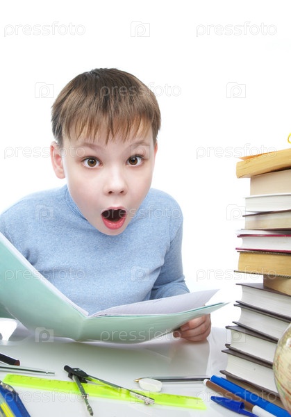 Мальчик сидит за столом со стопкой книг