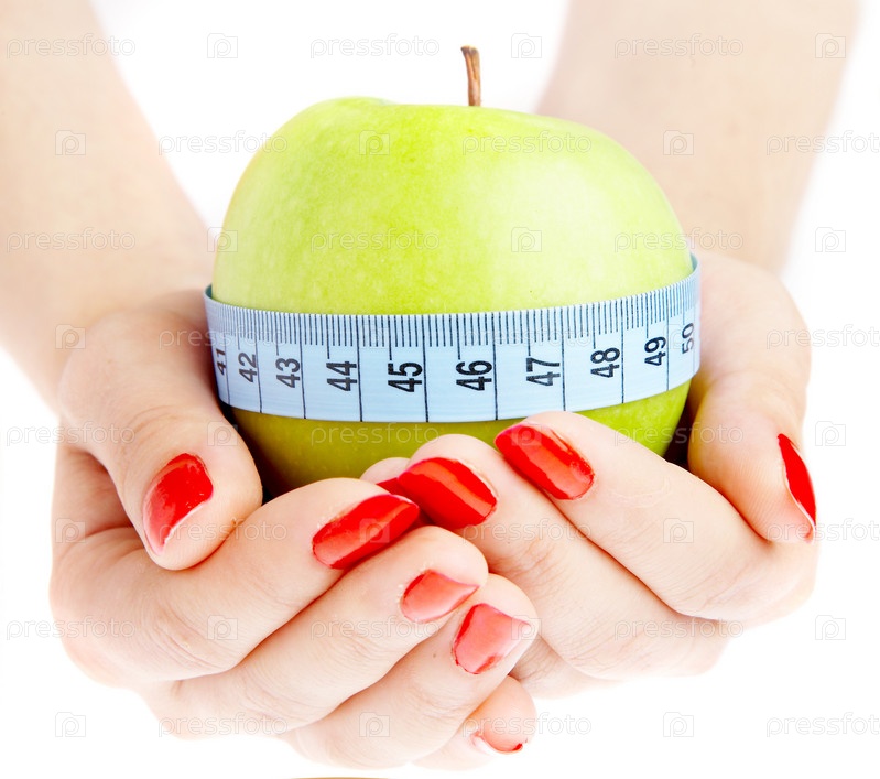 Яблоко с сантиметровой лентой в женских ладонях