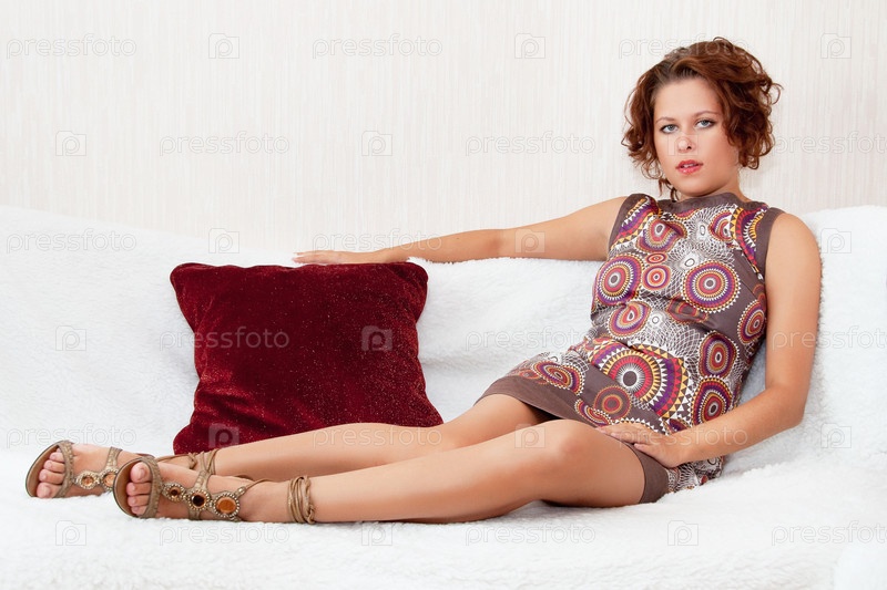 Молодая девушка с красивыми ногами сидит на белом диване