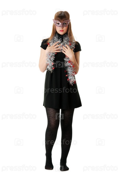 Юная девушка в маске на белом фоне