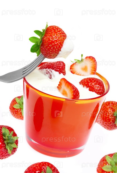 Спелая клубника со сливками на белом фоне