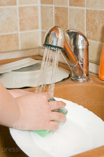 Женщина моет посуду на кухне