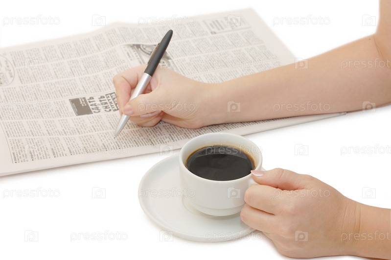 Просмотр объявлений в газете за чашкой кофе