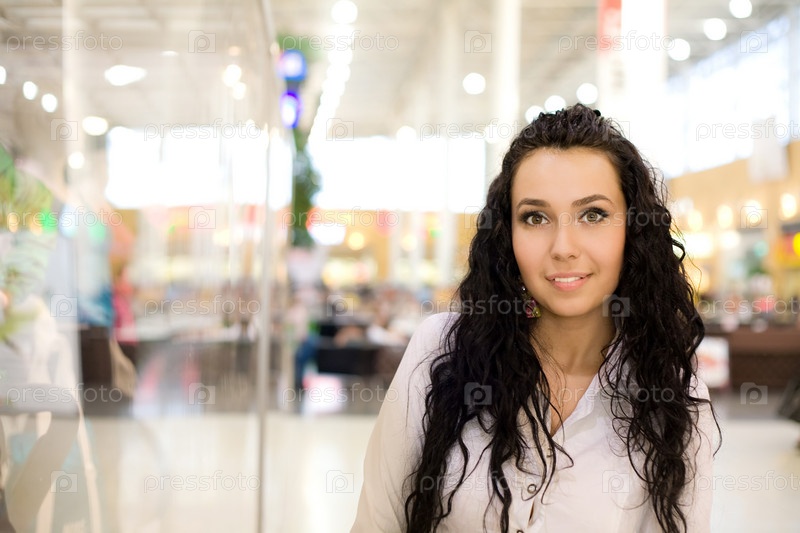 Улыбающаяся брюнетка стоит в магазине у витрины