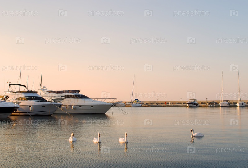 Яхты и белые лебеди в тихой бухте