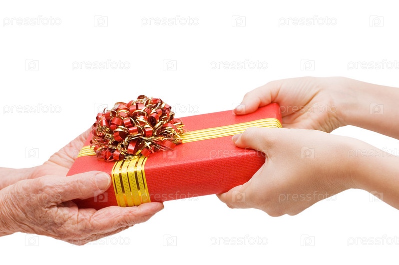 Руки, дарящие и принимающие подарочную коробку, изолированные на белом фоне
