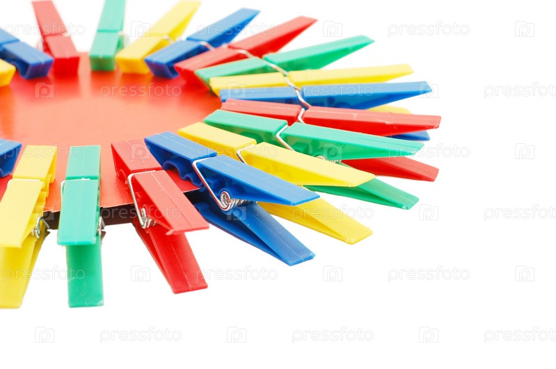 Куча разноцветных прищепок на белом фоне