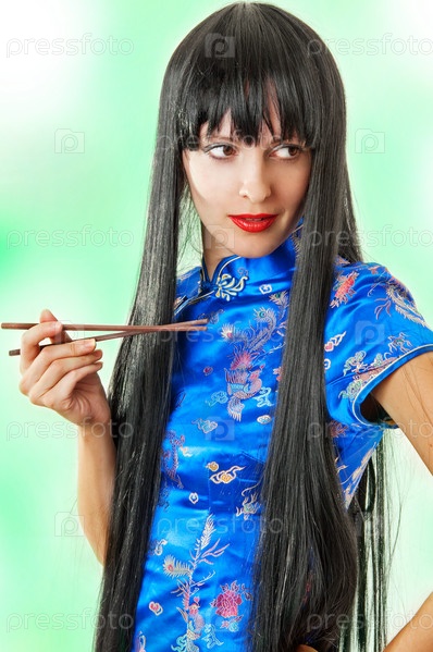 Брюнетка в восточном платье с палочками для еды