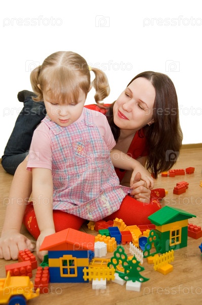 Маленькая девочка, играющая с мамой в конструктор на полу