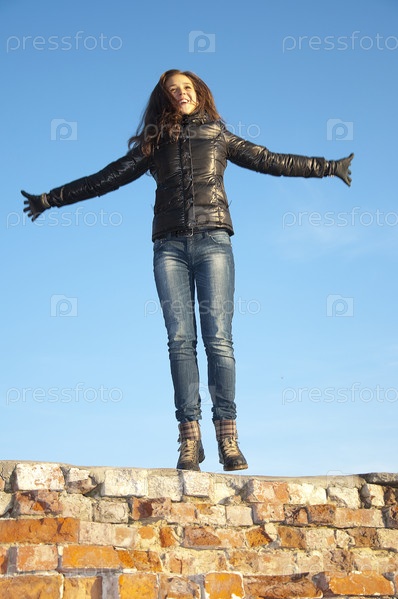Девушка стоит на кирпичной стене