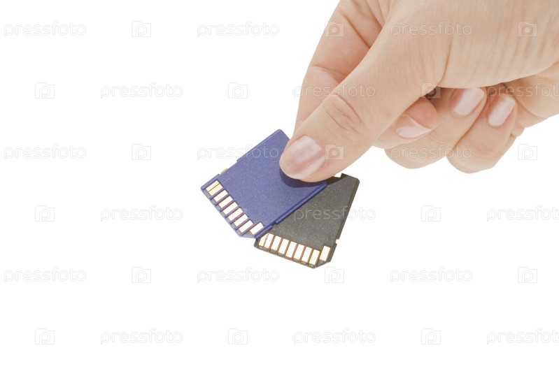 Две флэш-карты в руке на белом фоне