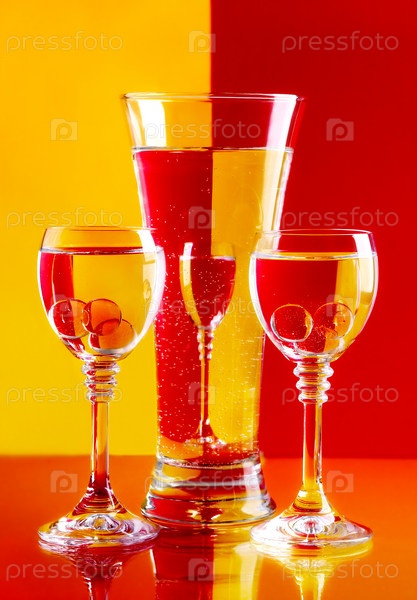 Стакан и две рюмки на желто-красном фоне