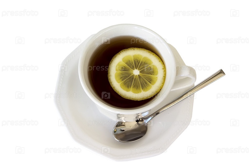 Суп чая с лимоном и чайной ложкой, изолированный на белом фоне