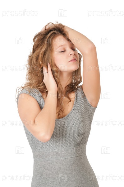 Молодая блондинка с закрытыми глазами позирует на белом фоне