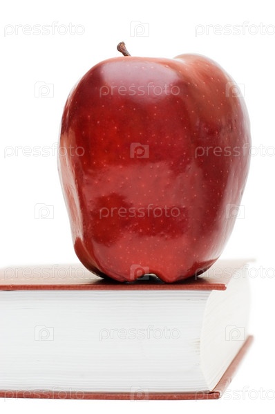 Красное яблоко на книге, изолировано на белом