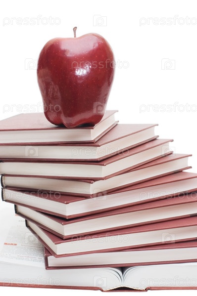 Красное яблоко на стопке книг, изолировано на белом