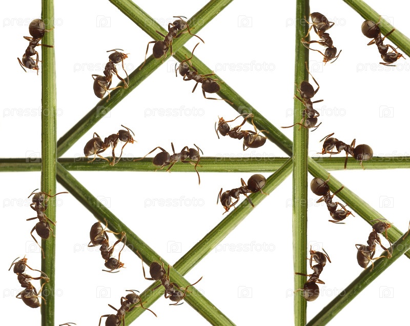 Муравьи на зеленых стеблях на белом фоне