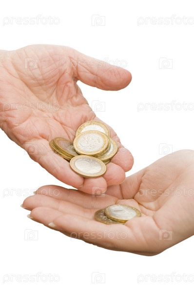 Монеты сыплются из старой руки в молодую