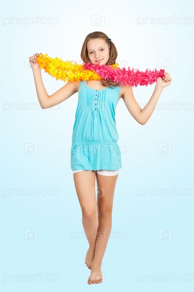 Девочка-подросток с цветным боа позирует, на голубом фоне